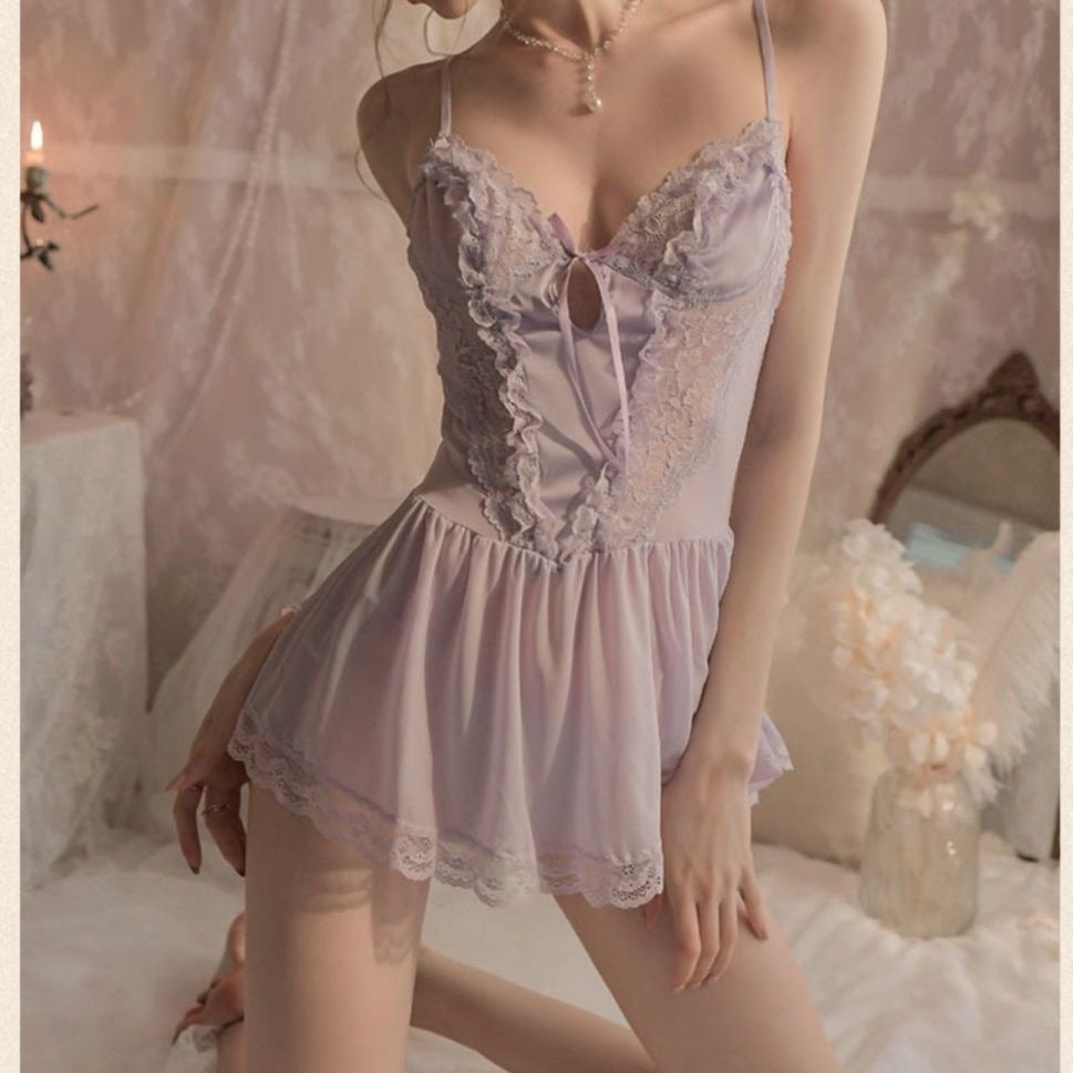 浪漫睡裙 - 轻奢紫色蕾丝吊带睡裙